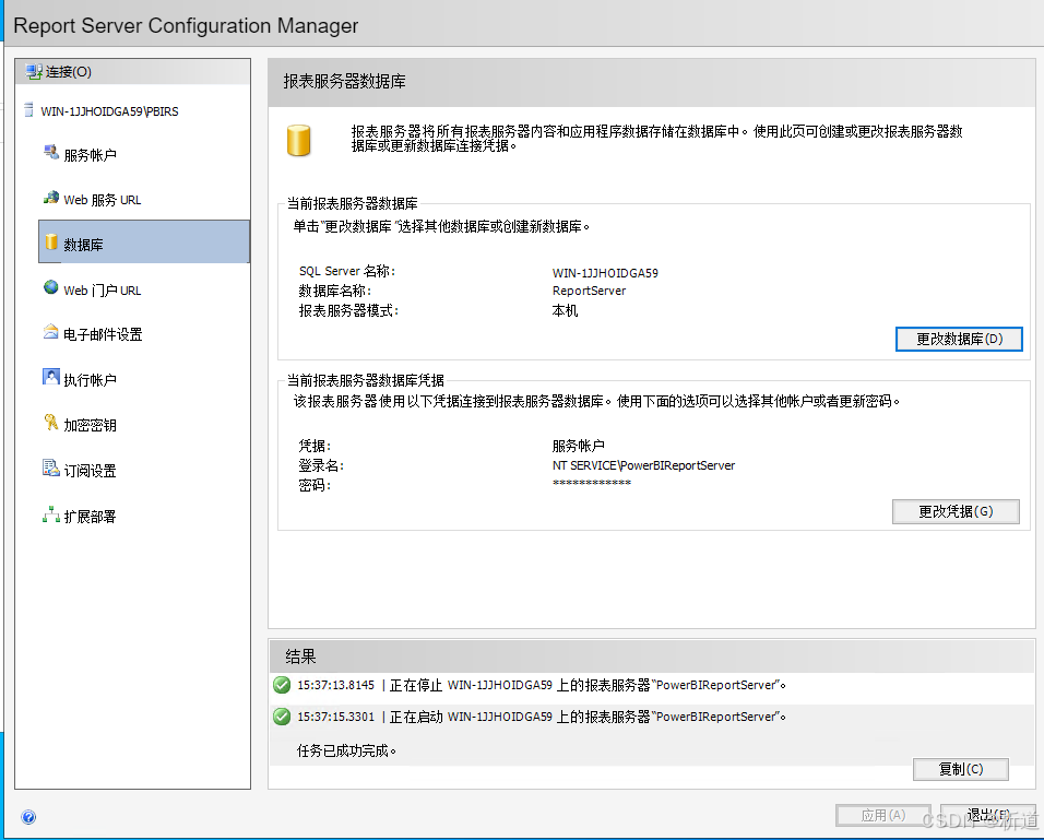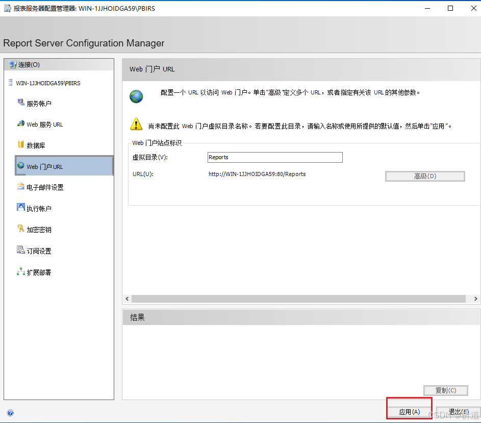 服务账户(指的是运行报表服务器的账户),默认是虚拟服务账户(最小权限),如果需要连接到另一台计算的SQL Server应该选择网络服务,然后点击应用即可: