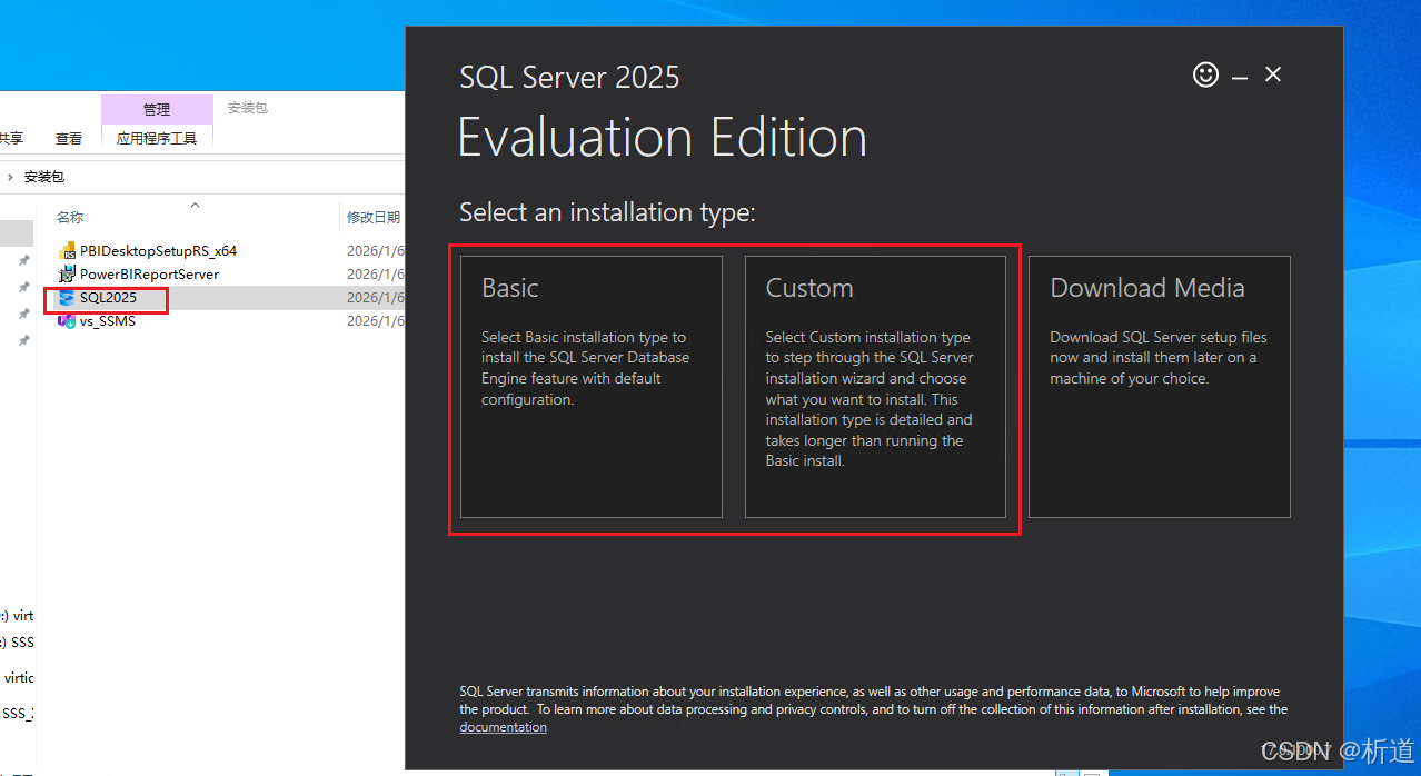 运行SQL2025 这个安装包。可以选择Basic,或者Custom这两种部署方式。这里以Custom为例子: