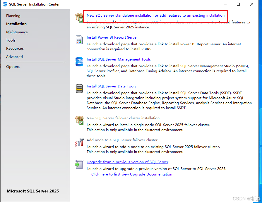 然后,我们需要点击第一个,一个新SQL Server实例安装(如果已有SQL Server实例,想升级可以点击最下面的Upgrade: