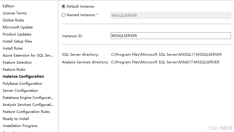 Instance Configuration这里如果没有实例,使用默认实例,如果已经有了实例,不想影响到其他业务,可以使用named instance :