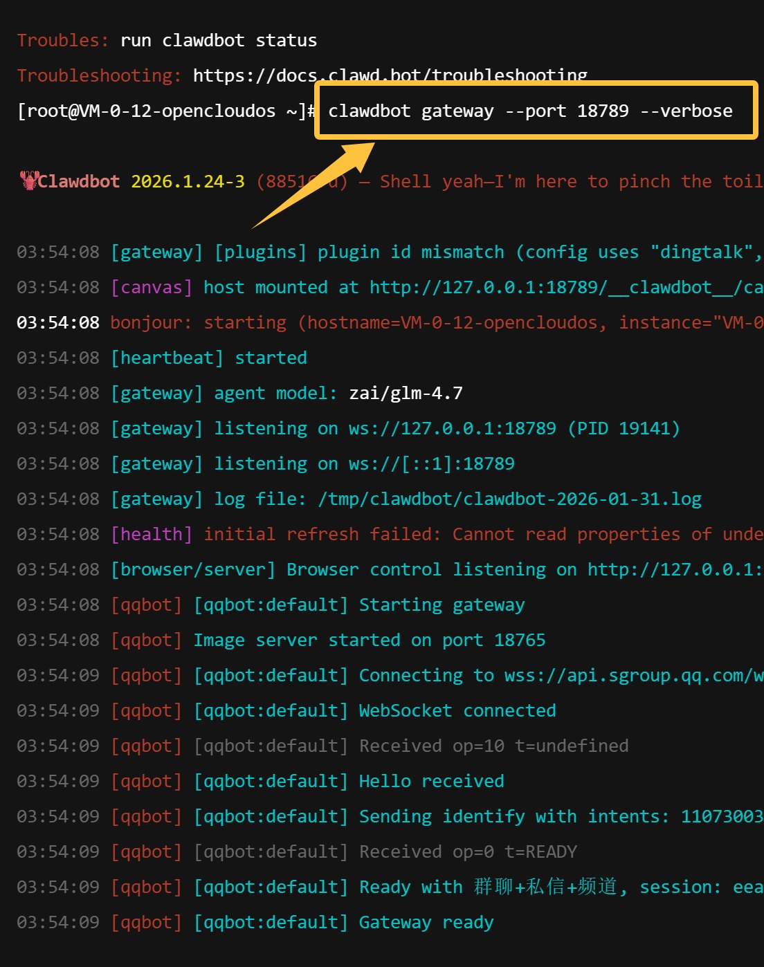 从日志中可以看到已经有 qqbot 相关的内容了。