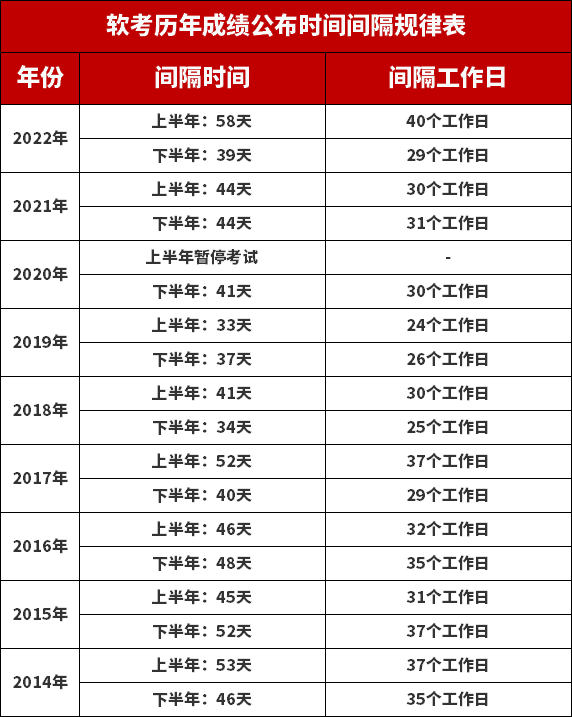 软考各个科目的成绩查询时间都是一致的,一般在考后一个月就能查询成绩,下面是软考历年成绩公布时间以及间隔规律表: