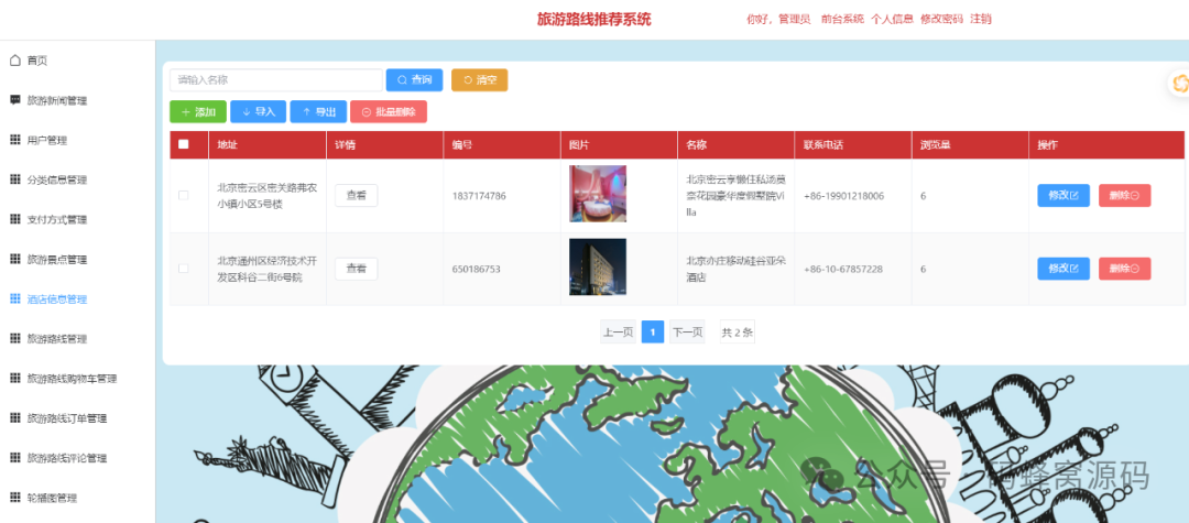 本系统主要功能有:用户注册和登录、旅游路线管理、个性化旅游路线推荐、旅游景点管理、酒店信息管理、旅游路线预订、旅游路线订单管理等模块:
