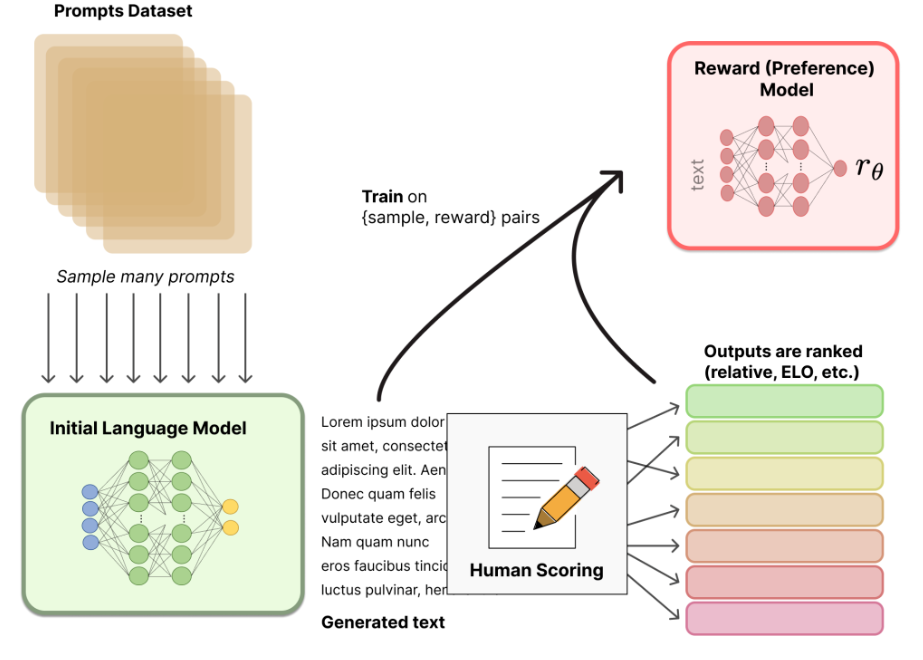 * 第三步:利用这些人类偏好排序数据,训练奖励模型(Reward Model),让奖励模型的评分能够尽可能贴合人类的判断;最终,大语言模型再依据这个奖励模型的评分机制进行优化,从而让生成结果更符合人类的偏好和需求。