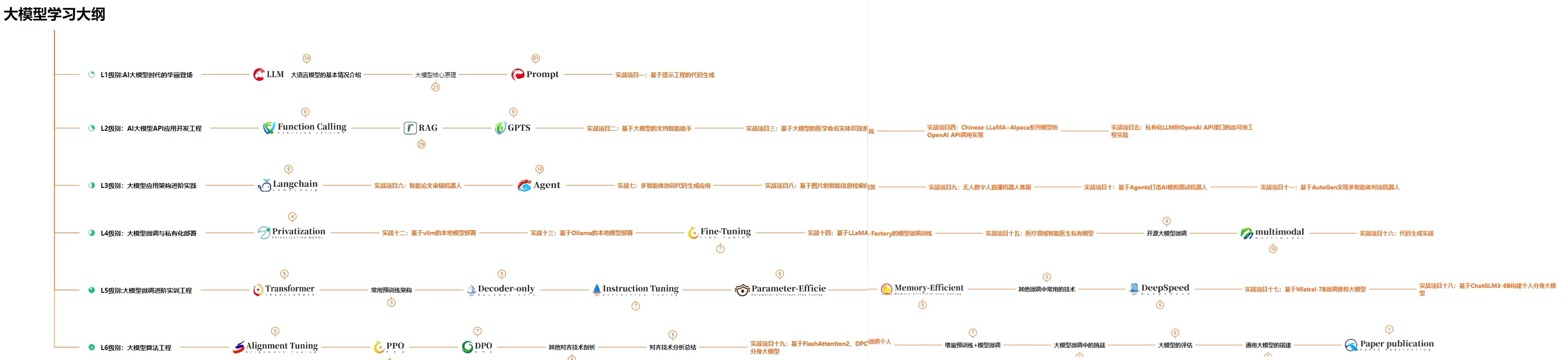 接下来是进阶篇,你将掌握RAG、Agent、Langchain、大模型微调和私有化部署,学习如何构建外挂知识库并和自己的企业相结合,学习如何使用langchain框架提高开发效率和代码质量、学习如何选择合适的基座模型并进行数据集的收集预处理以及具体的模型微调等等。