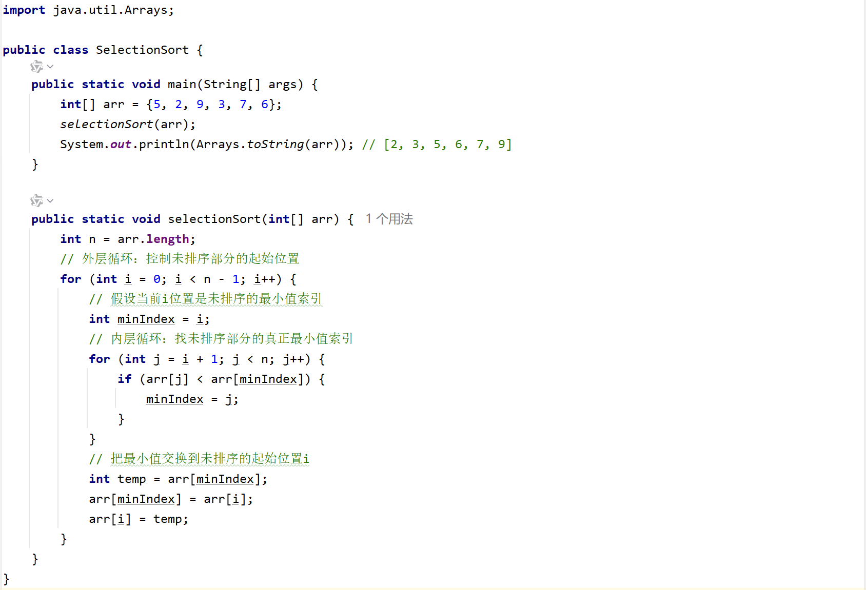 - 核心特点:每轮确定一个最小值的位置,交换次数远少于冒泡。