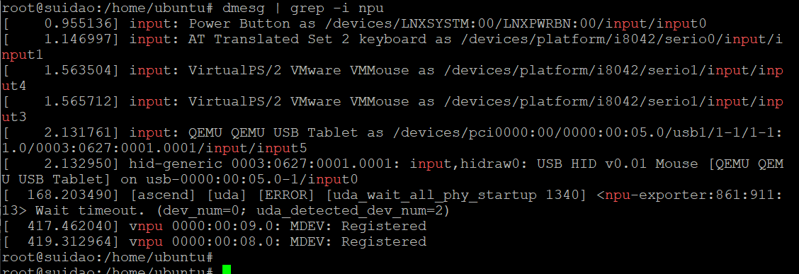 [ 168.203490] [ascend] [uda] [ERROR] [uda_wait_all_phy_startup 1340] Wait timeout. (dev_num=0; uda_detected_dev_num=2)