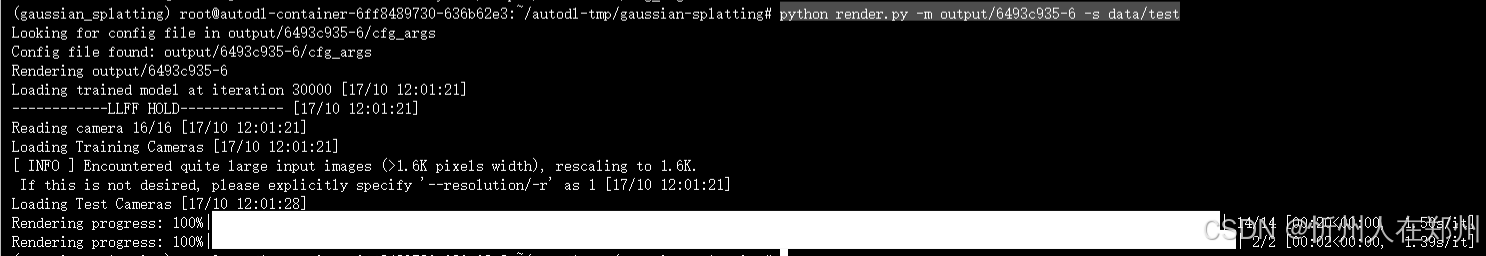 可以参考解决3DGS中评估模型时出现“Unable to compute metrics for model”的问题解决方案,但是博主试了没用,或者可以重新从六、评估章节重新训练,渲染,注意不要点开训练后的结果图片文件,当执行完上述命令再查看图片(博主这样做就可以了,可能是在服务器点击图片查看后就会生成.ipynb_checkpoints文件,从而导致上述报错)。