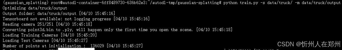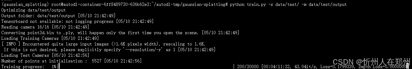 使用下述命令训练-s后面为数据集输入路径、-m后面为结果输出路径,可以根据自己放置的位置灵活修改,下面以训练train为例: