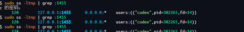 出现网址链接不要关闭该终端,新建一个终端后输入代码,检查是否在监听中: