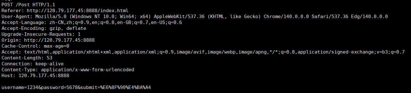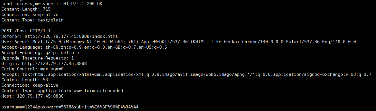 当进行POST方法的测试的时候,浏览器可以看到如下界面,可以看到最后一行是我们提交的用户名和密码。