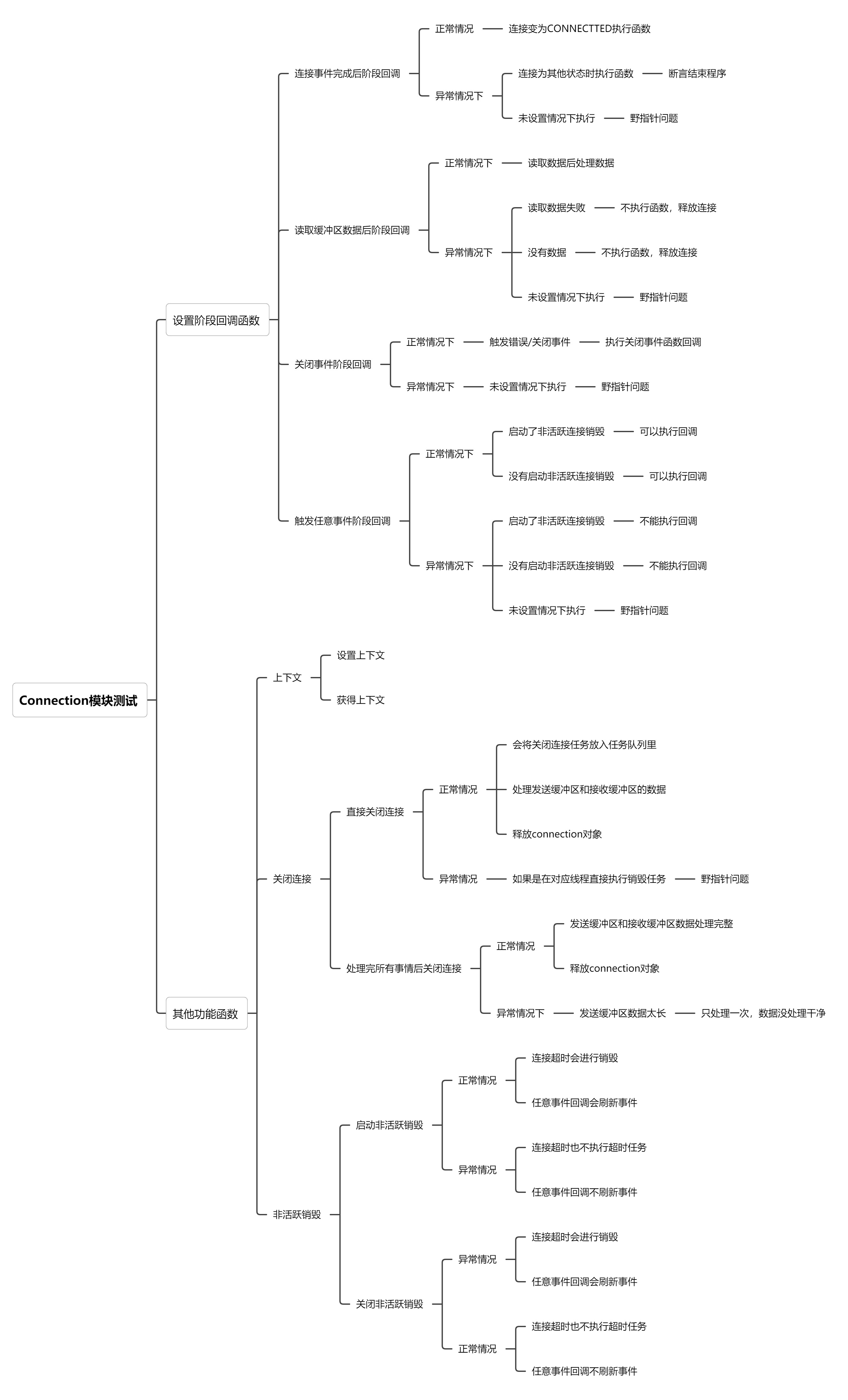 connection模块用于管理一个通信描述符,主要功能是给通信描述符设置对应的阶段回调函数,设置完之后如果触发对应的读事件/写事件/任意事件/错误事件/关闭事件,就会在这些事件里调用外部设置的阶段回调函数,比如说触发了读事件之后,处理完缓冲区里的数据,就要对数据进行处理,就会调用对应的阶段回调函数,还有设置此通信描述符的非活跃连接销毁功能,以下是我设计的测试用例: