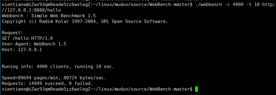 用于创建线程也需要开销,在这台机器上创建多个线程就会导致webbench崩溃,受限于性能原因,这边只测试一个主线程,零个从属线程的情况。