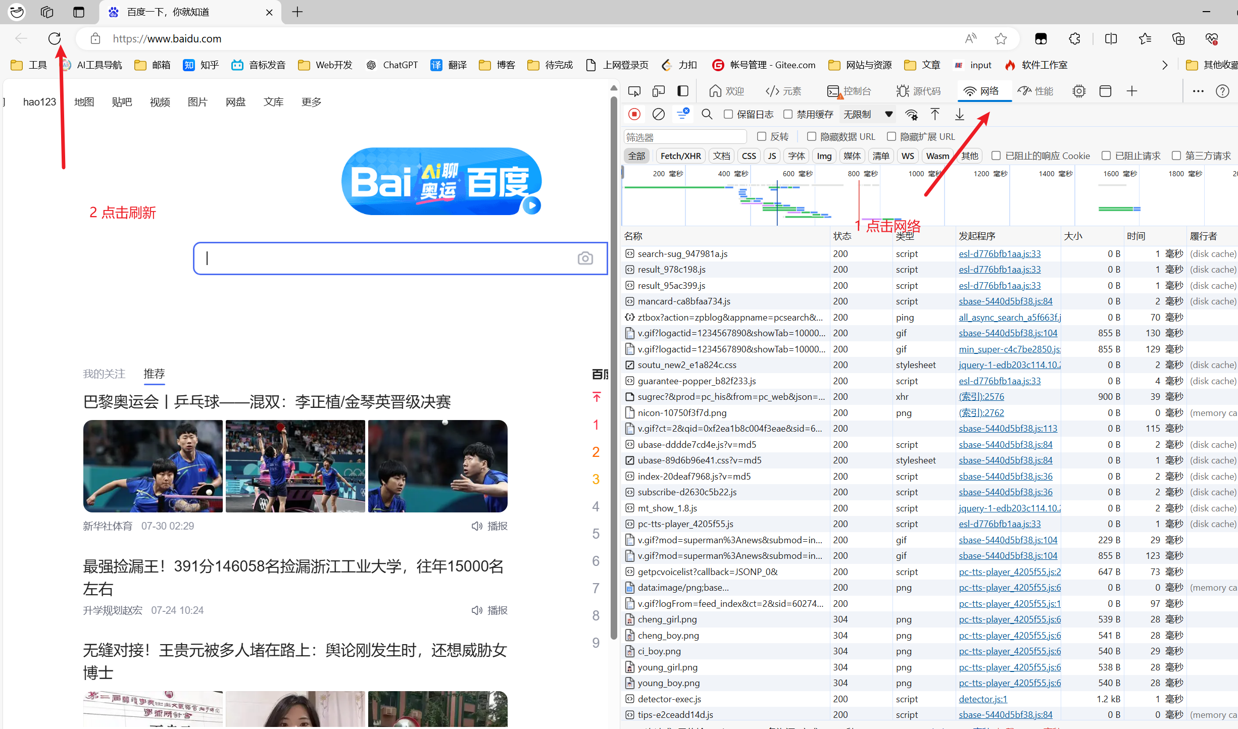 - 我们打开百度,点击F12打开开发者工具,然后按照上图所示操作