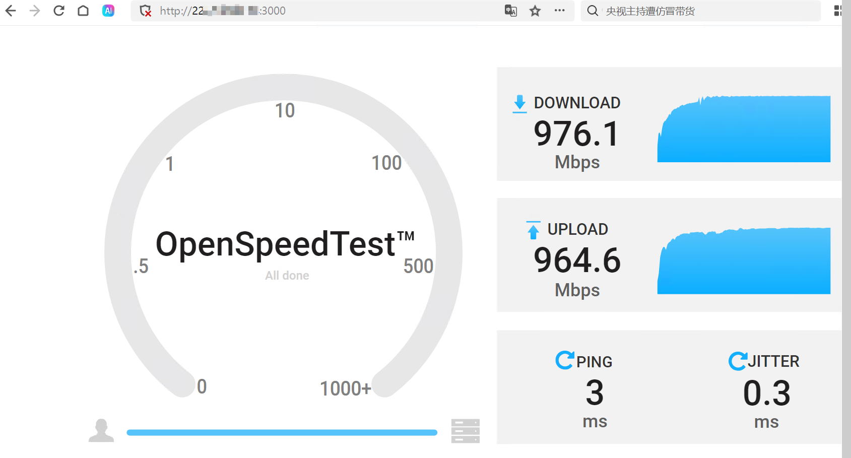 为测试NAT回流,笔者在内网服务器使用speedtest搭建了一个测速服务,端口号3000