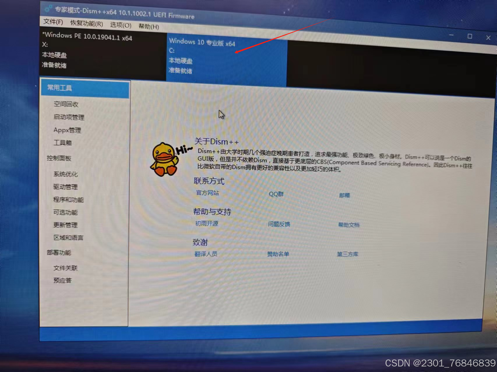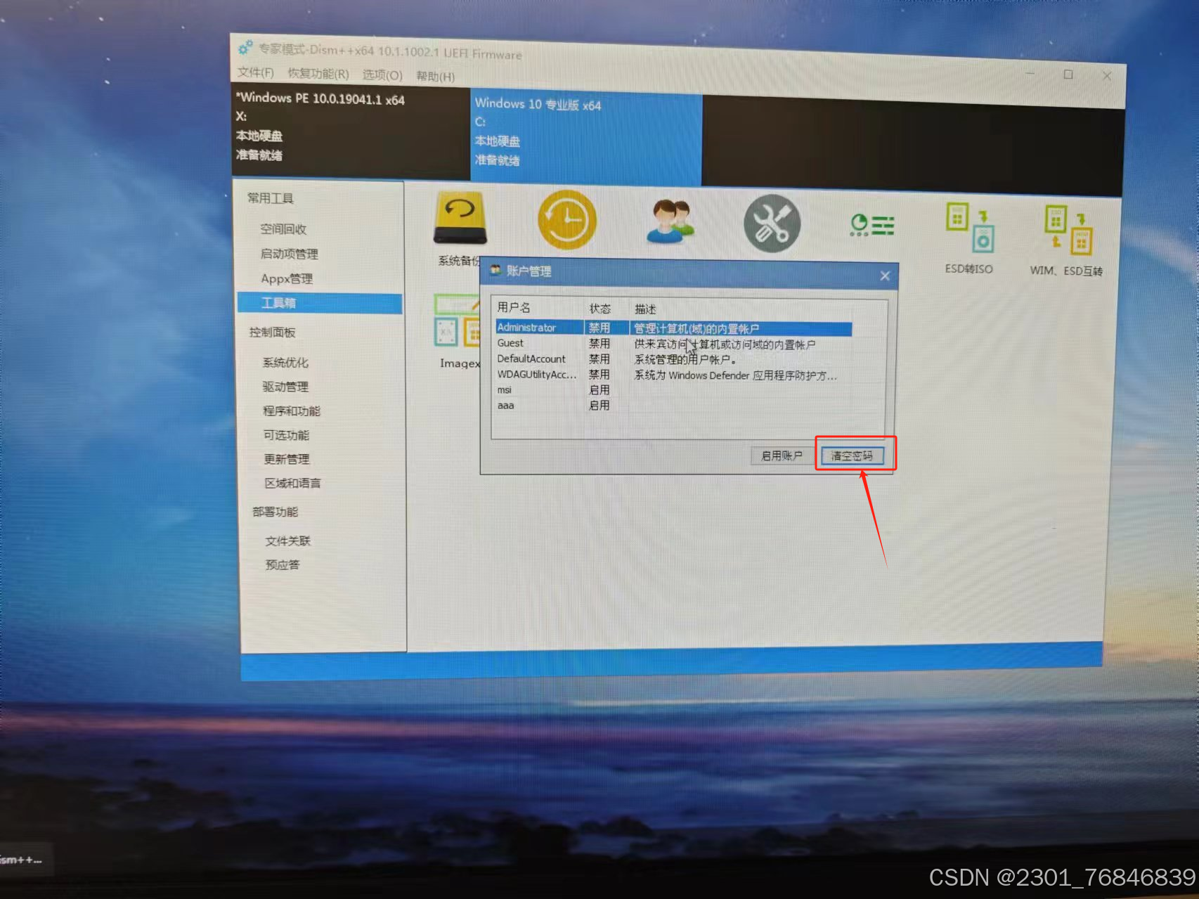 3.2我们点击键盘的↓键选择第二个,因为我们的U盘就叫EFI刚好对呀这里的UEFI(其实选择第三个也一样界面不同罢了),进入类似于正常桌面的页面,然后打开图标类似于小齿轮的DIsm++,(需要注意的是我们下载的版本是2.3,在2.1版本时,这个清空密码是单独列出来的。)