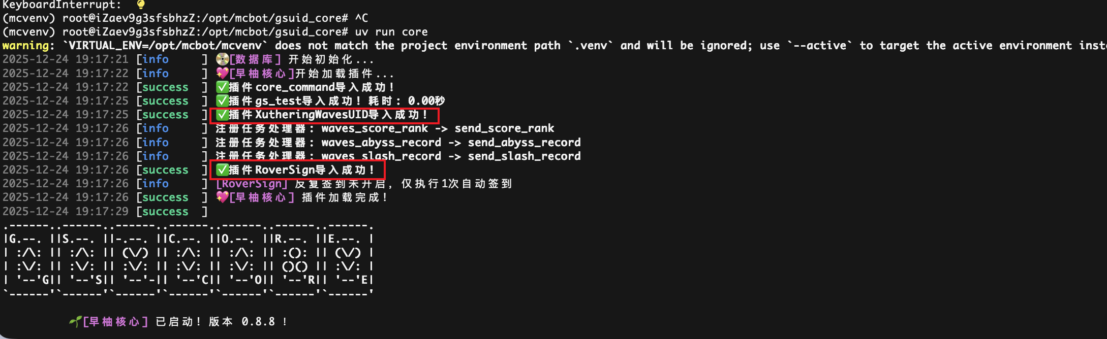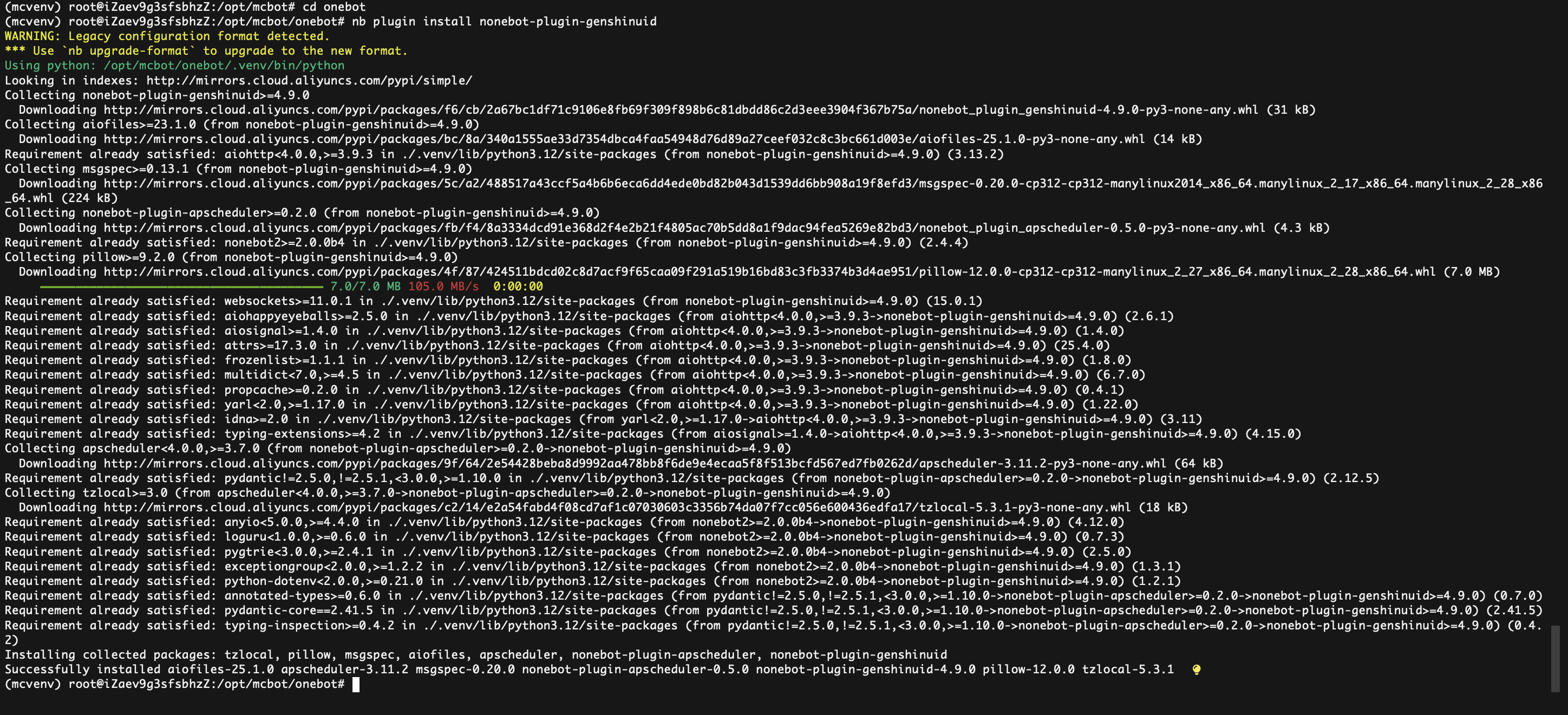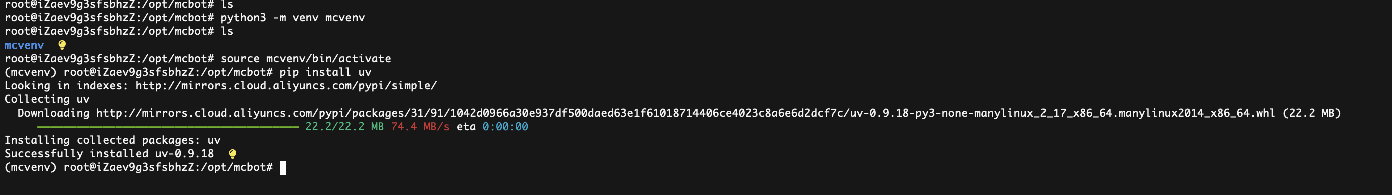 # 安装 python3-venv 虚拟环境包 sudo apt update sudo apt install python3.12-venv # 如果不确定 Python 版本,也可以安装通用的包 sudo apt install python3-venv python3-full # 在opt目录下创建文件夹mcbot sudo su # 回车后输入你的管理员密码 cd / cd opt mkdir mcbot cd /opt/mcbot # 创建虚拟环境,命名为mcvenv python3 -m venv mcvenv # 激活虚拟环境 source mcvenv/bin/activate(退出虚拟环境的命令:deactivate)