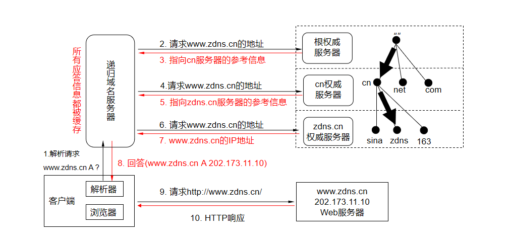 根服务器回复:“我不直接存储,但.com顶级域名服务器的地址是 xx.xx.xx.xx,你去问它。”