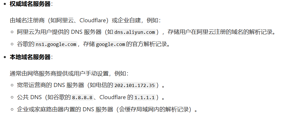 功能:直接存储域名对应的 IP 地址及其他解析记录(如 A 记录、AAAA 记录、CNAME 记录、MX 记录等)。例如,百度的权威 DNS 服务器存储www.baidu.com→180.101.50.242、map.baidu.com→xxx.xxx.xxx.xxx等记录。