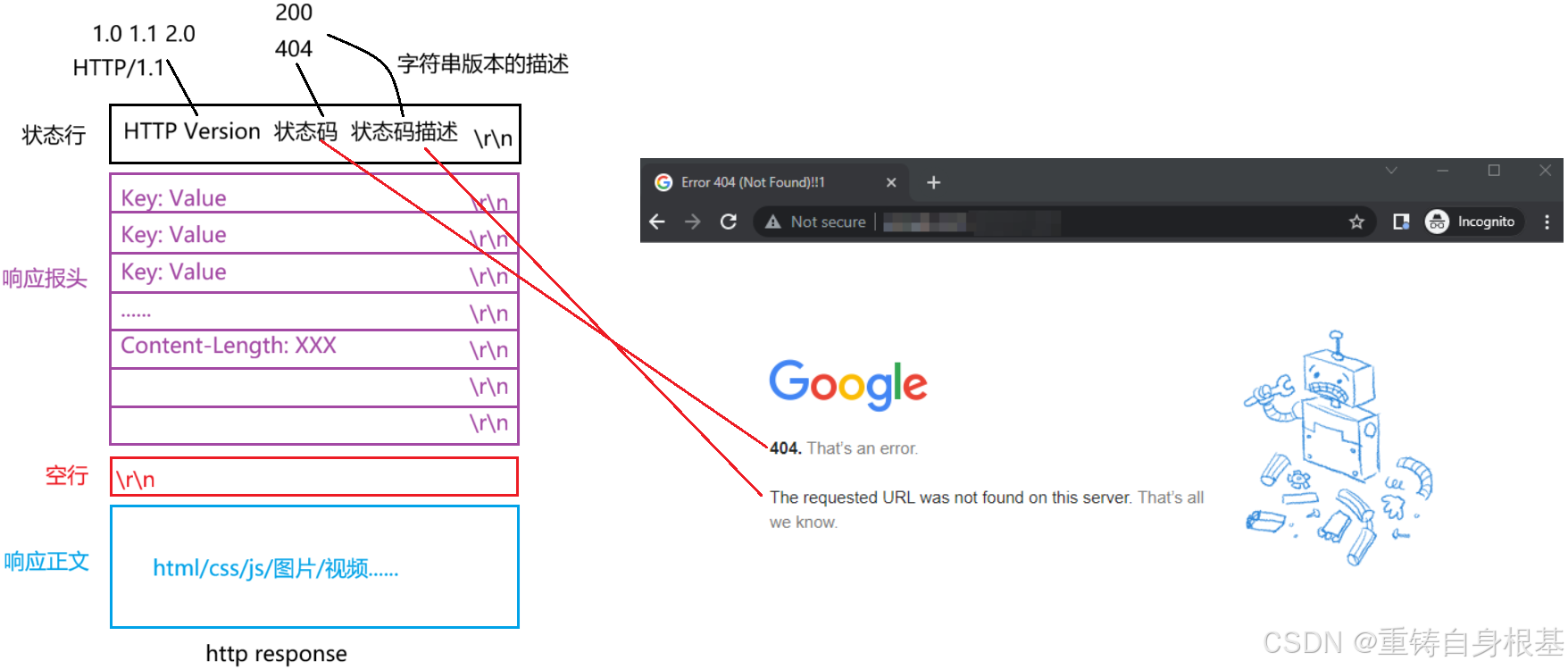 - 那么我们主要讲解状态行,状态行的字段中第一个字段是HTTP Version即http的版本,同样的,版本可以是1.0 1.1 2.0,主流版本一般是1.1,那么进行写入的时候需要加斜杠/,即HTTP/1.1这种格式,第二个字段是状态码,例如200,404等,第三个字段是状态码的字符串形式的描述,那么第二个字段和第三个字段相信大多数的读者友友都曾经见到过,即对应右图的界面,状态行的各个字段同样需要空格进行分隔,并且状态行的结尾是