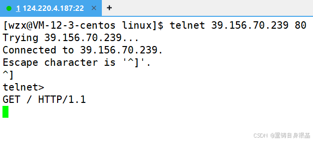 - 那么小编在文章开头已经在windows的终端cmd上ping出了百度的IP地址 39.156.70.239,那么下面小编使用linux上的telnet我们自己构建http请求报文,然后进行访问,那么百度的端口号是80,在telnet上访问的格式是telnet IP地址 端口号
