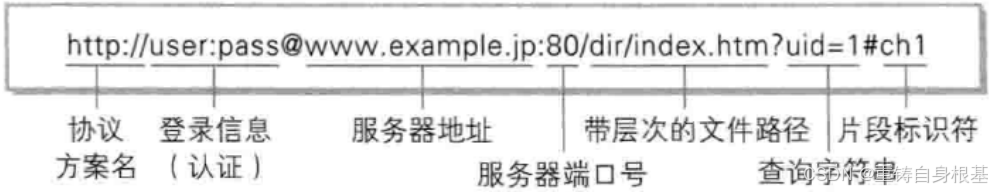 - 那么第一个字段通常是https://或者http://格式,是进行协议的选择然后冒号两个斜杠进行分隔,第二个字段是登录信息,目前几乎不使用了,可以省略,所以我们不关心,然后分隔符@也可省略,第三个字段是服务器的地址,即虽然填写的是一个域名,但是我们要知道这个是可以被经过域名解析然后转化为服务的IP地址的,然后分隔符是冒号,通常冒号也可省略,接下来就是服务器的端口号通常也可以省略,因为浏览器已经将很多的常用服务器对应的端口号已经内置了,接下来是 / 其中这个 / 我们称之为web根目录,这个目录有可能是根目录同样也有可能是采用的相对路径的根目录,那么 /dir/index.htm 我们称之为带层次的文件路径,其实就是要访问的资源的存放路径