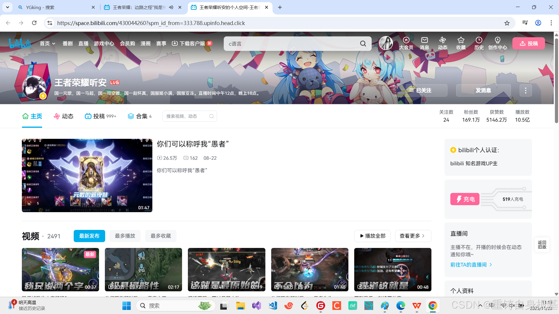 - 所以我们就拿到了如上界面,即王者荣耀听安的主页,而我们关注的不是YGking,不是元歌单挑,也不是王者荣耀听安,而是是哔哩哔哩王者荣耀听安对应的浏览器中最上方的网址