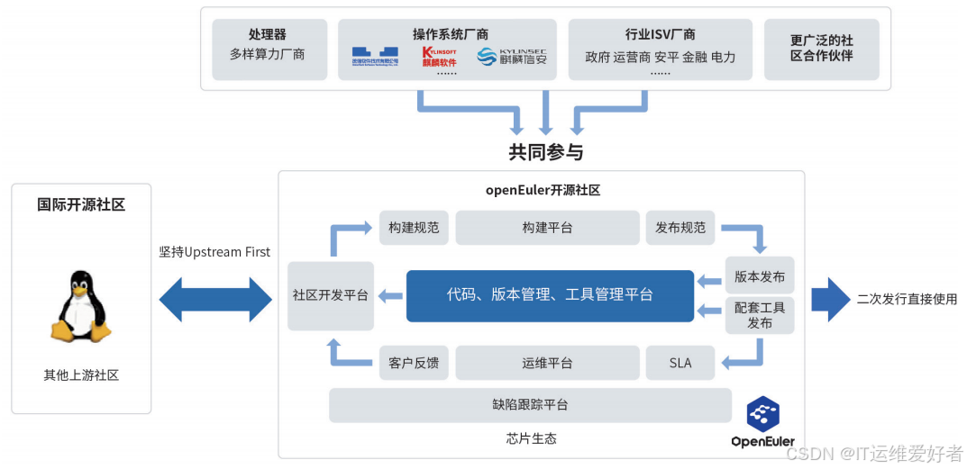 openEuler 社区与上下游生态建立连接,构建多样性的社区合作伙伴和协作模式,共同推进版本演进。