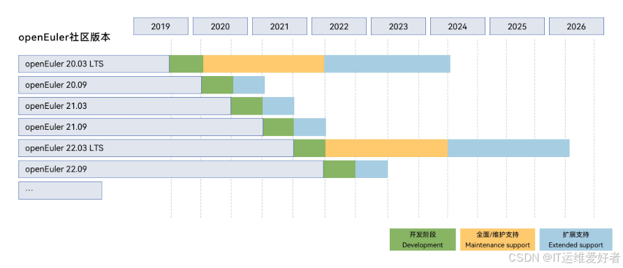 :发布间隔周期定为2年,提供4年社区支持。社区首个LTS版本openEuler 20.03 LTS于20年3月发布,基于5.10内核的openEuler 22.03 LTS于22年3月发布。偶数年3月发布新一代LTS首版本,偶数年12月,奇数年6月、12月发布对应SP版本。 - 社区创新版本