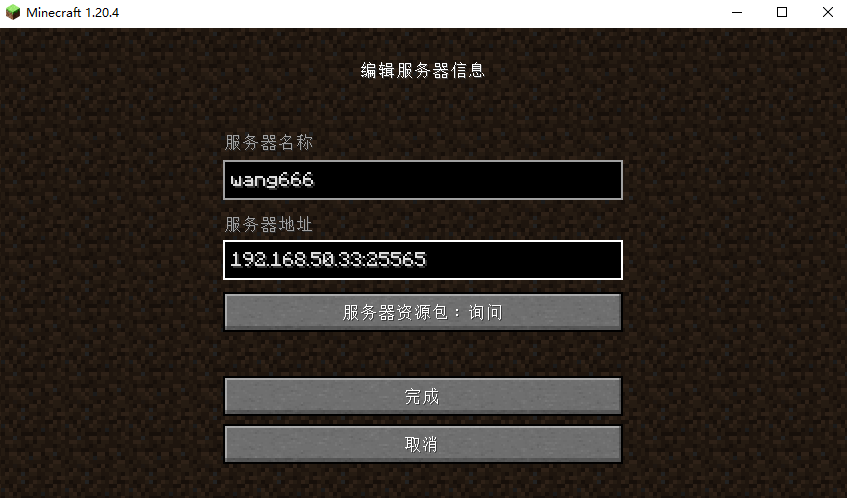 打开我的世界,选择多人游戏,点击刚才创建的服务器选择编辑,使用cpolar中生成的公网地址进行连接,点击完成
