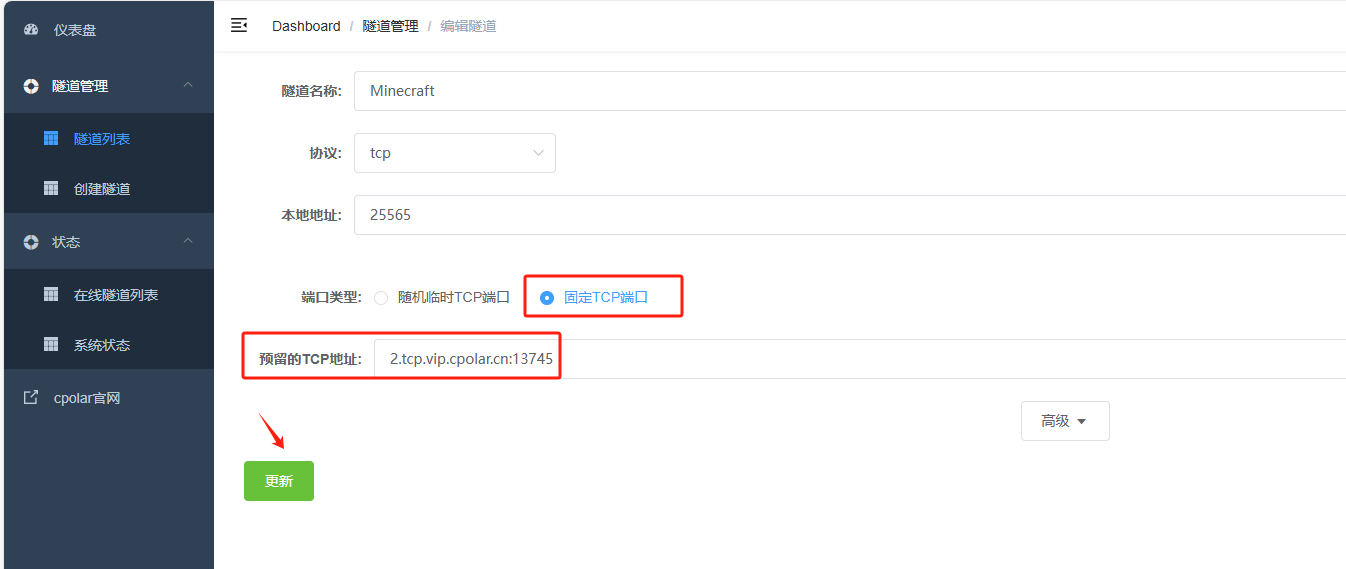 隧道更新成功后,点击左侧仪表盘的状态——在线隧道列表,找到我的世界隧道,可以看到公网地址已经更新成为了固定tcp地址。