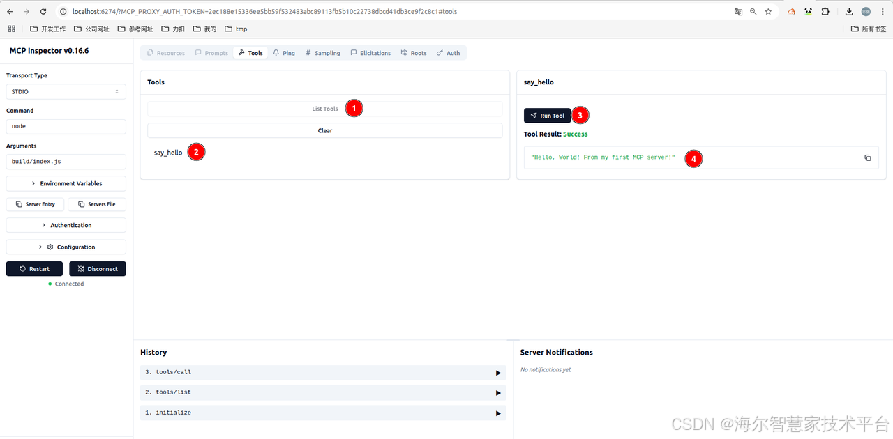 奇迹发生了!在右侧的 Tool Result 中,你应该能看到服务器执行成功,并返回的消息: "Hello, World! From m y first MCP server!"