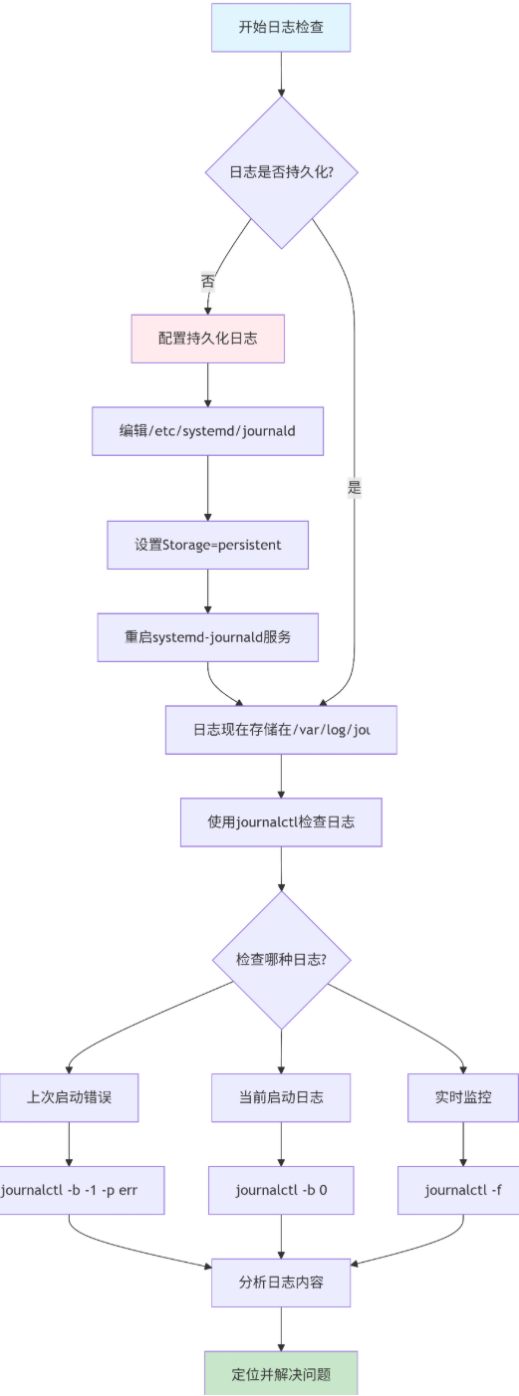 若需日志在重启后保留,需配置为存储到 /var/log/journal 目录(永久文件系统)。