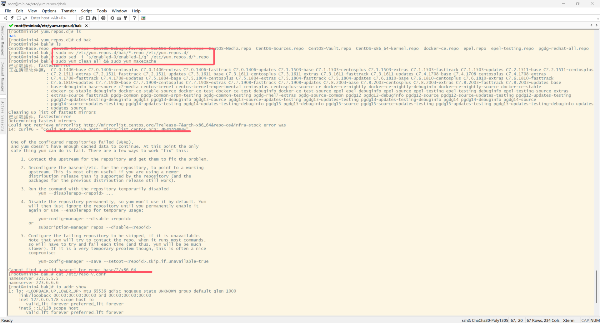 查看显示yum repolist all 为空,repolist:0。想着昨天最后是删除并进行备份,写入时卡住后面不了了之,今天继续。