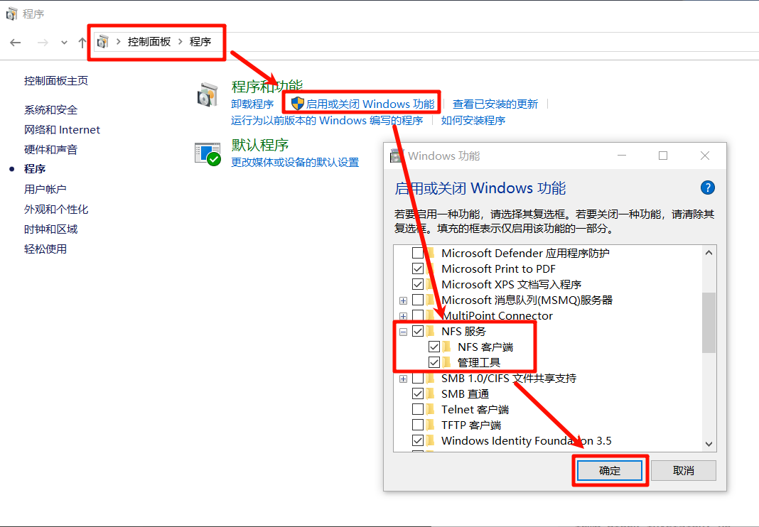 (2)在弹出的窗口中找到“NFS服务”,打开并选中子目录的选项,在点击“确定”进行加载;