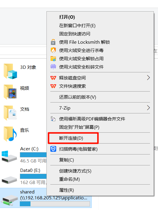 (4)在“此电脑”的共享磁盘处右键单击可以选择“断开连接”。