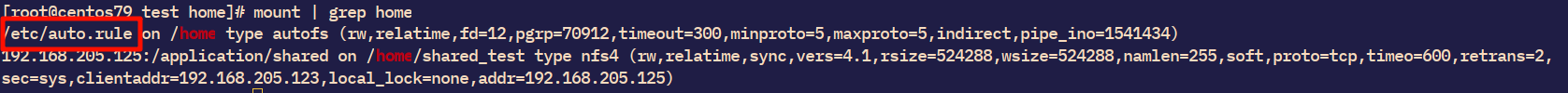 mount | grep home查看home目录的挂载情况,可以发现auto.rule文件按照auto.master被自动挂载到home下;