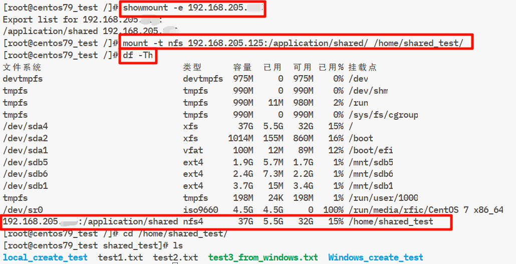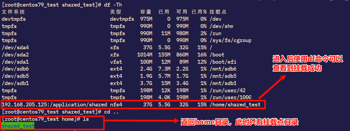 (2)在克隆虚拟机使用命令:mount -t nfs 主机的IP地址:/application/shared /home/shared_test,将共享目录挂载到克隆虚拟机的/home/shared_test目录,可以使用df -Th命令检查挂载情况;