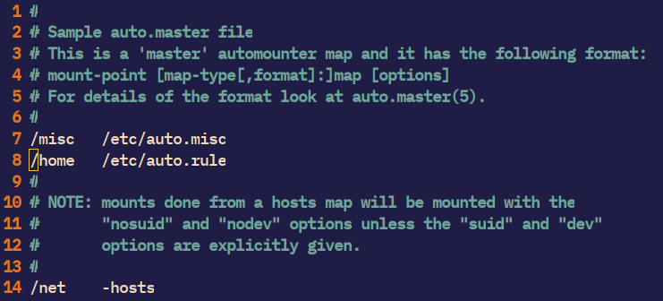 7 /misc /etc/auto.misc # 文件内本来就有,不用修改 8 /home /etc/auto.rule # 超时时间哦欸之:--timeout=600 # 语法:[挂载点基目录] [映射规则文件路径] [可选参数] # 挂载点基目录:为挂载目录的父目录,如/home/shared_test/的父目录为/home,也称一级挂载点; # 映射规则文件路径:子挂载规则文件路径,该文件需要自行创建并添加对应规则; # 可选参数:通常为设置超时时间,超时自动卸载,单位为秒(s)。