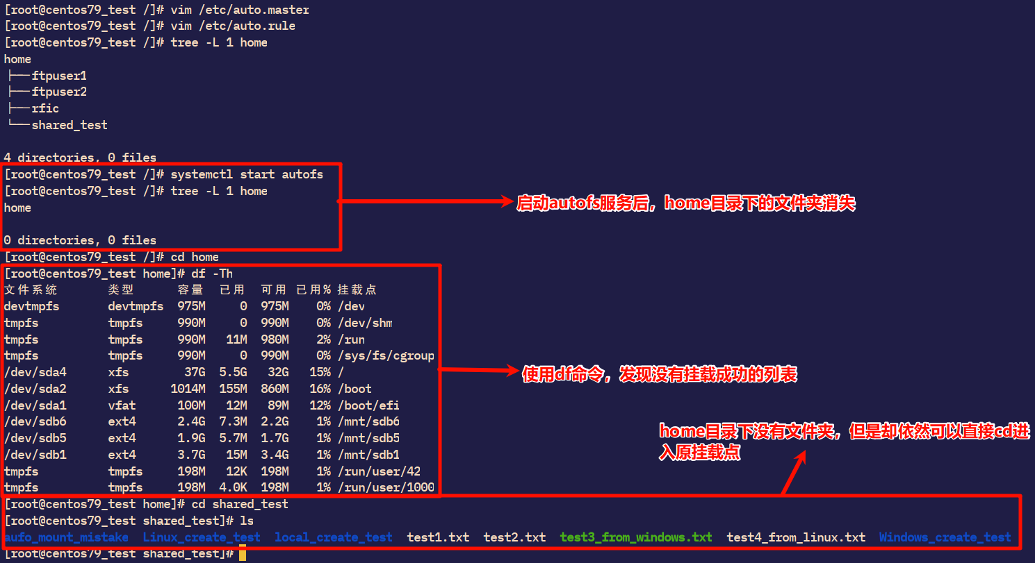 autofs服务后,打开home目录发现内部的所有文件夹消失不见,包括用户的家目录/home/rfic、/home/ftpuser1和/home/ftpuser2,以及原定的挂载点文件夹shared_test,使用df -Th命令检查挂载情况也没有线索; -