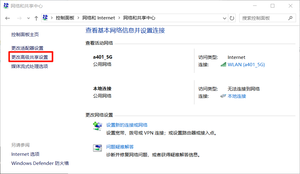 (2)进入后点击左侧边栏中的“更改高级共享设置”;