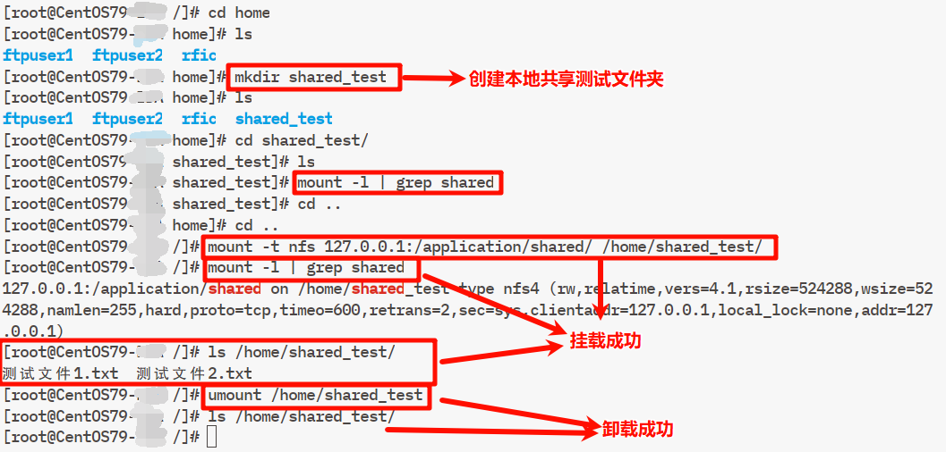 (2)将共享目录挂载至本地挂载目录:mount -t nfs 127.0.0.1:/application/shared /home/shared_test;
