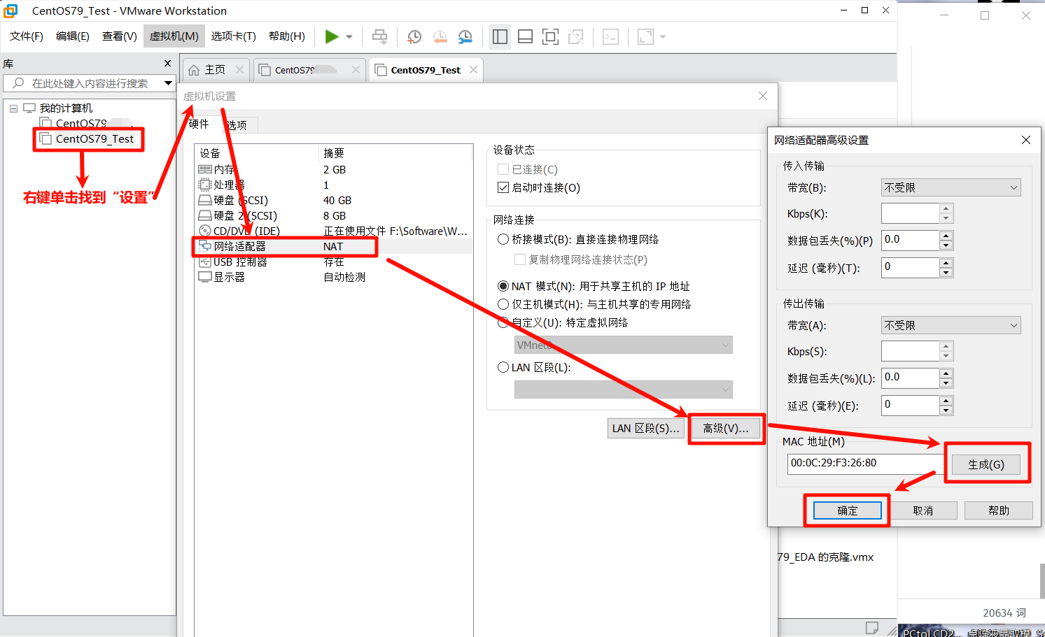 (2)克隆完成后,需要修改mac地址,在“设置”中找到“网络适配器”,选择“高级”,点击“生成”进行MAC地址的更换,再点击“确定”即可。
