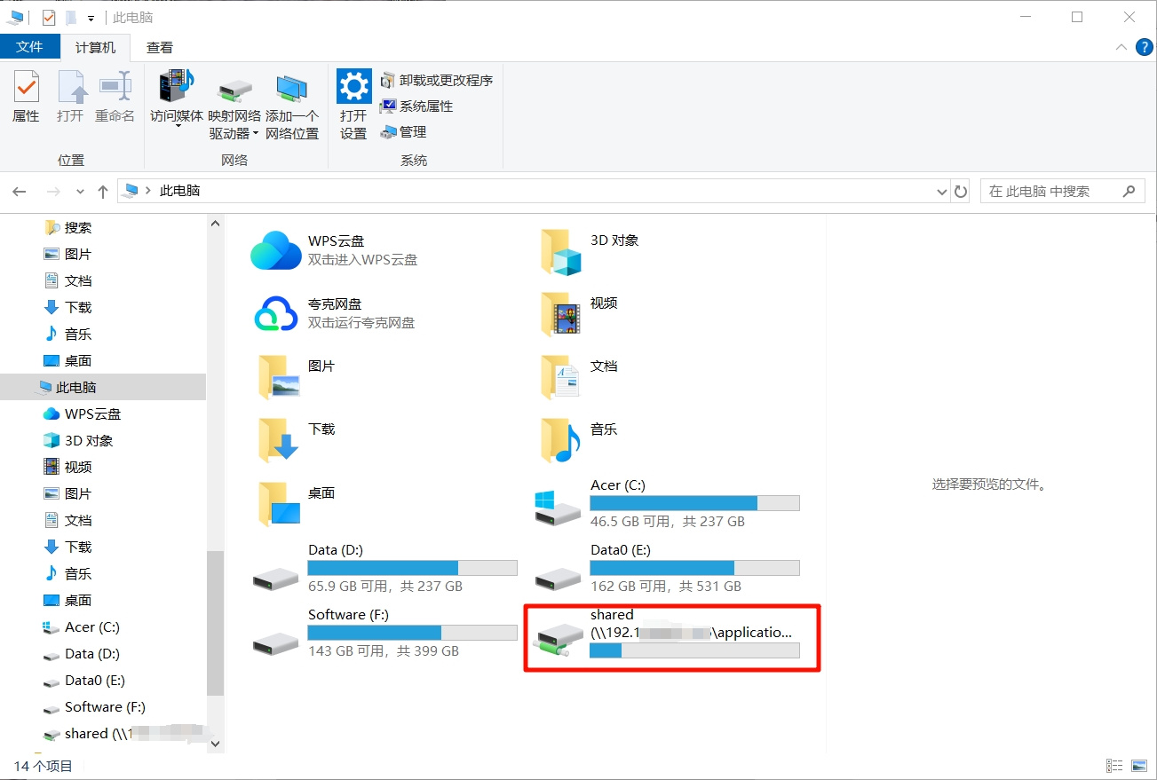 (3)在文件管理器的“此电脑”页面能找到挂载的文件夹,双击进入,可以添加、修改、删除文件并创建文件夹。