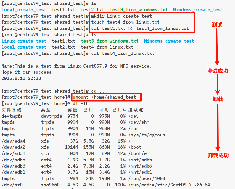 (5)测试完毕,卸载共享:umount /home/shared_test