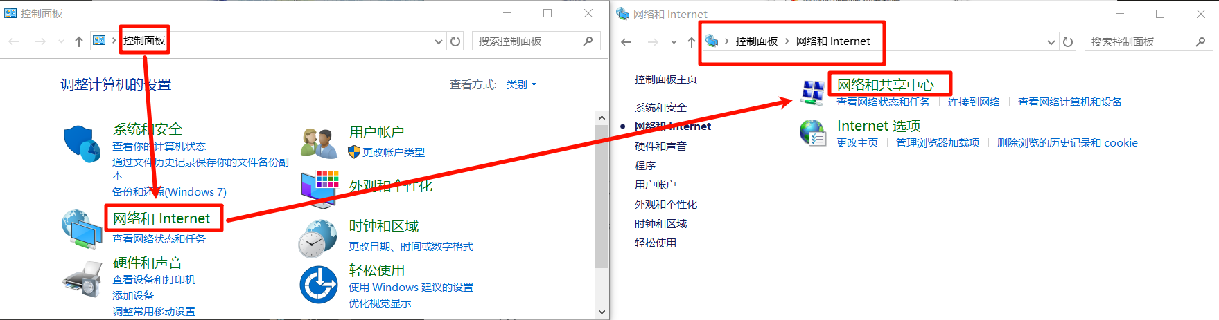 (1)打开“控制面板”,点击进入“网络和Internet”,再点击进入“网络和共享中心”;