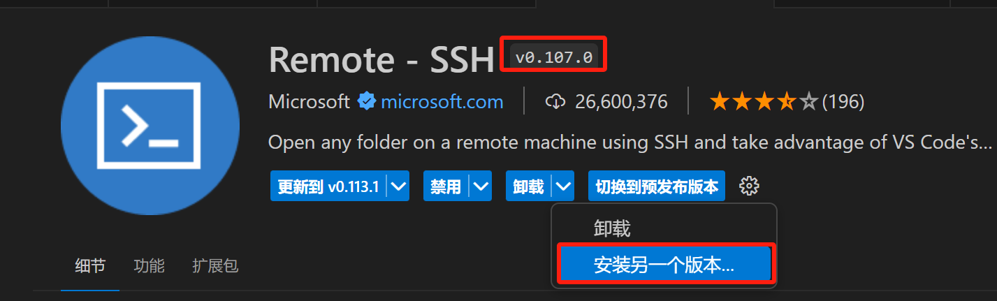 点开 Remote-SSH 的详情页面(直接点 Remote-SSH 的图标就会出现),点击卸载按钮右边的下拉箭头,点击 安装另一个版本… ,安装 v0.107.0 (pre-release) 版本的 Remote-SSH。