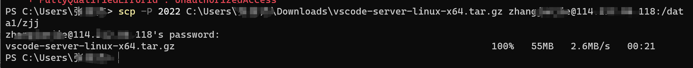 scp -P 2022 C:UsersxxxDownloadsvscode-server-linux-x64.tar.gz zhangxx@114.xx.xx.xx:/your/pwd