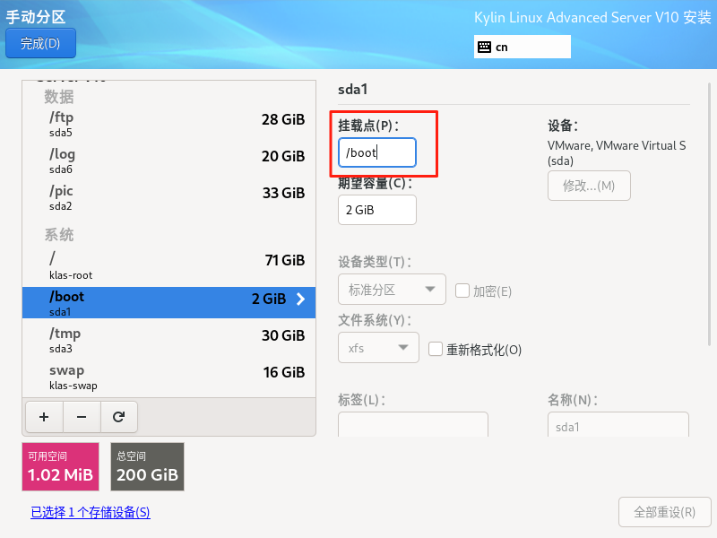 点击左侧/boot然后在“挂载点”输入/boot